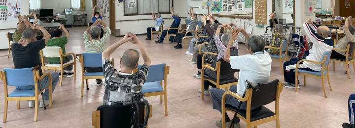朝と昼食後に集団体操を行っています。